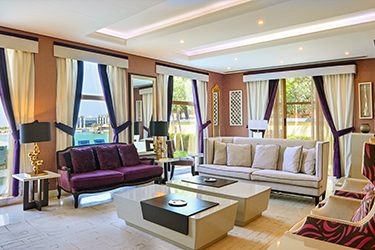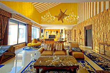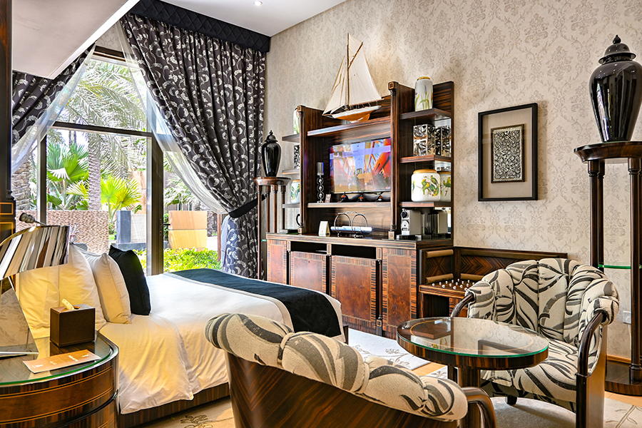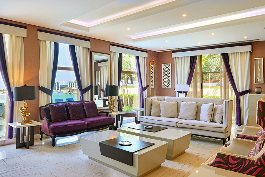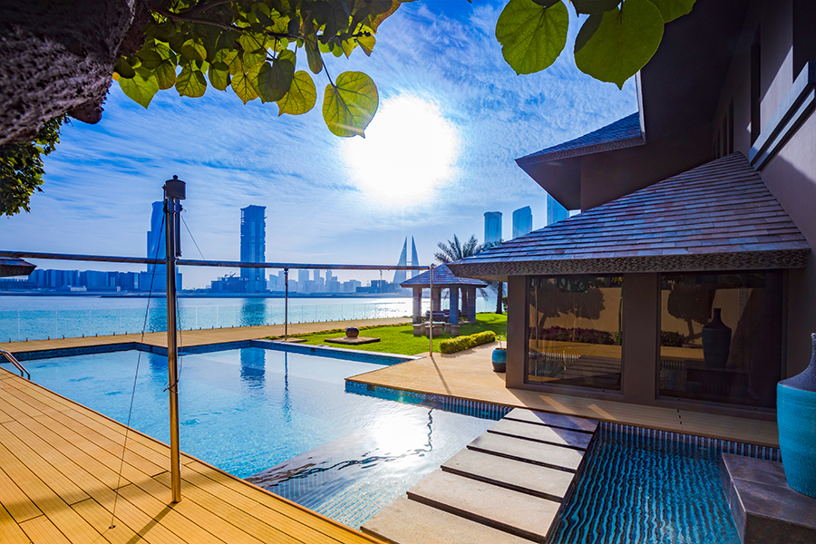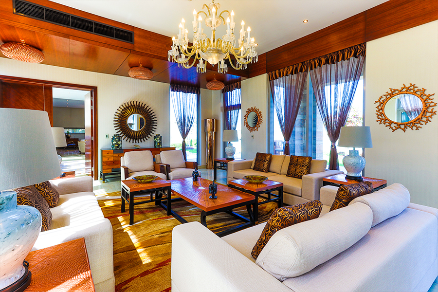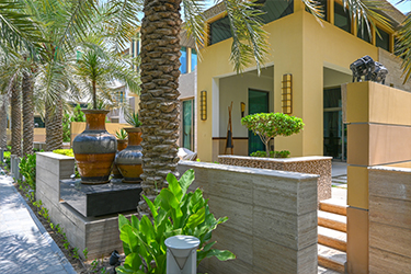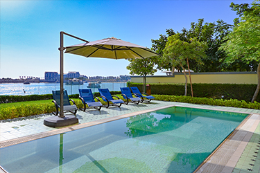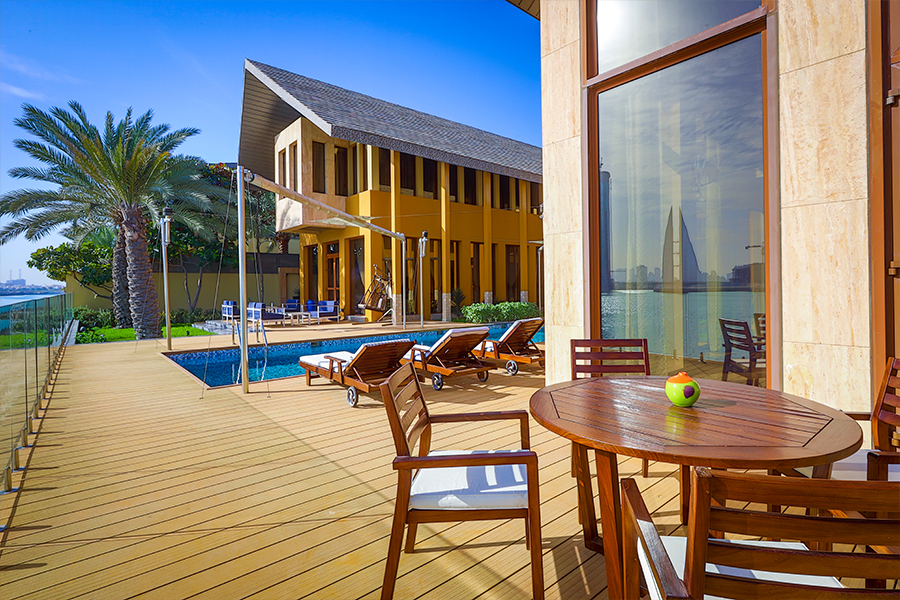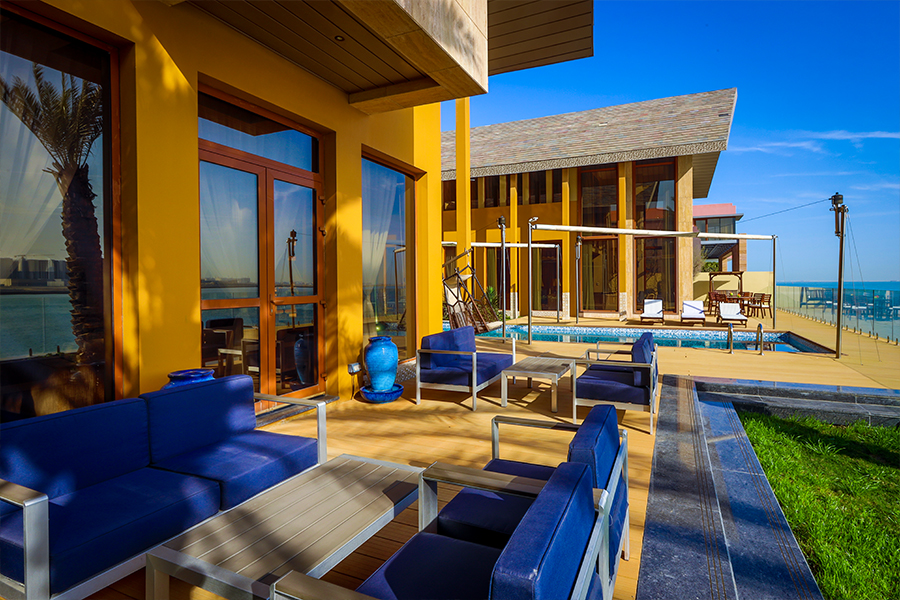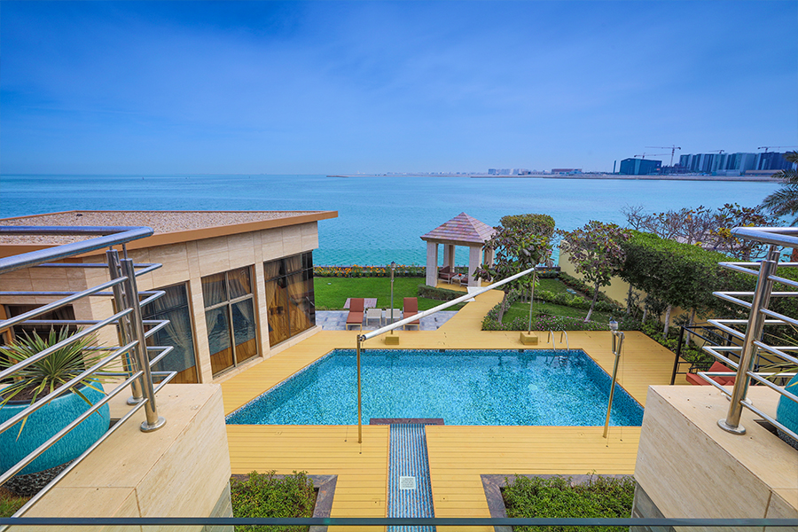 The high quality granite used for the villa’s facades, pedestrian walkway and stepping stones. The gardens are characterised by spacious landscaping with allotted areas surrounded by palm trees, artistic water features and teak wooden deck terraces. The dual swimming and wading pools tiled in Bisazza mosaic style have a backdrop of a wall water feature and overlook the open sea or lagoon.