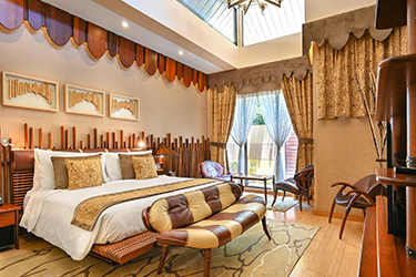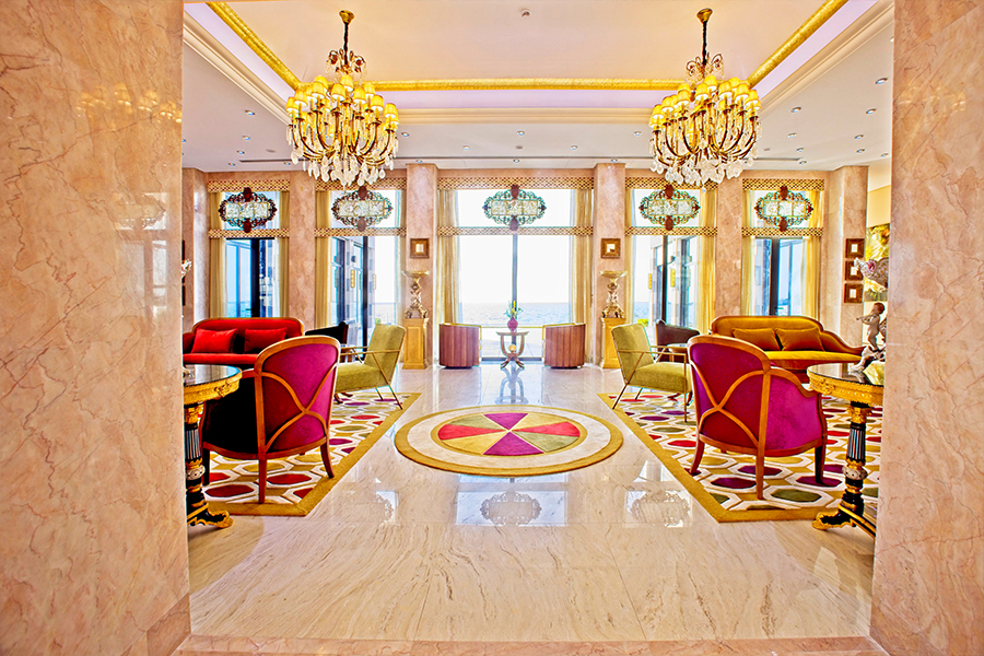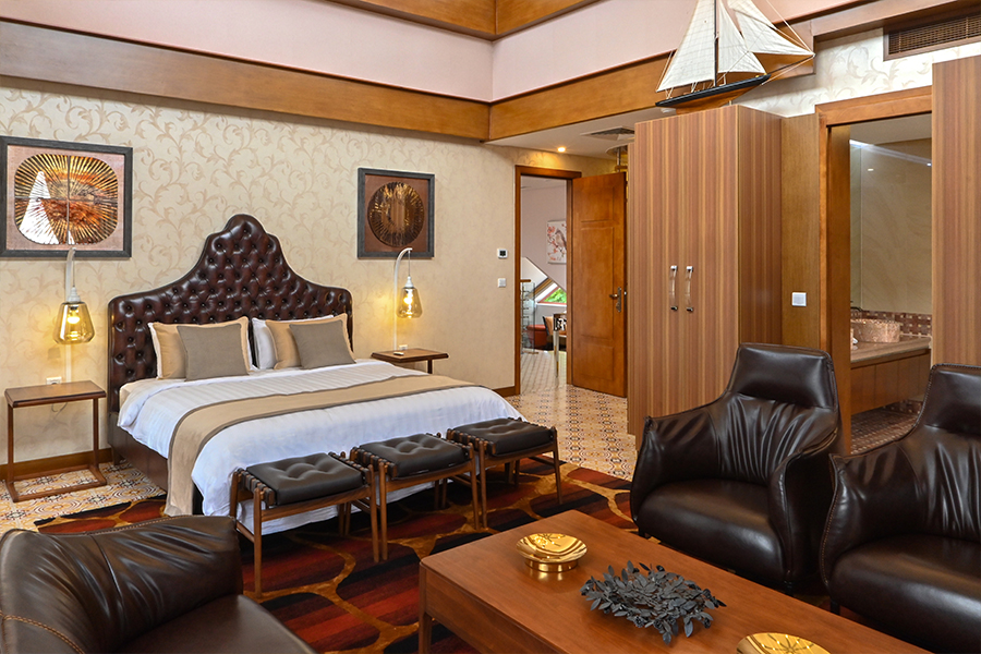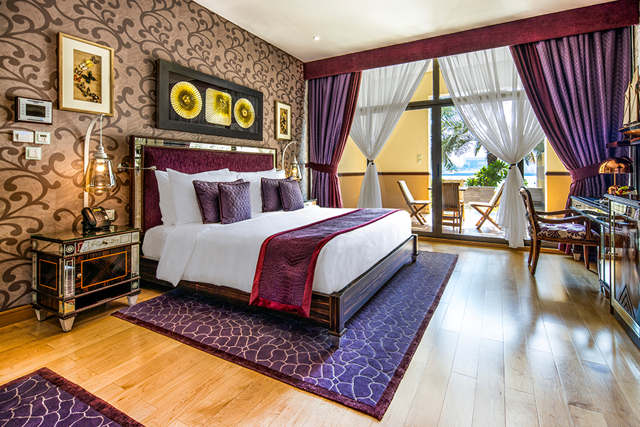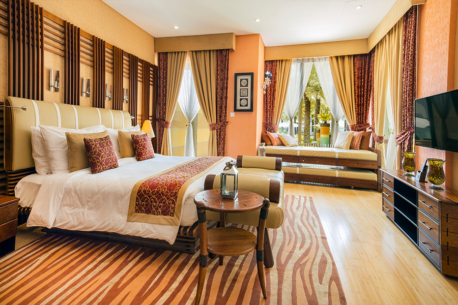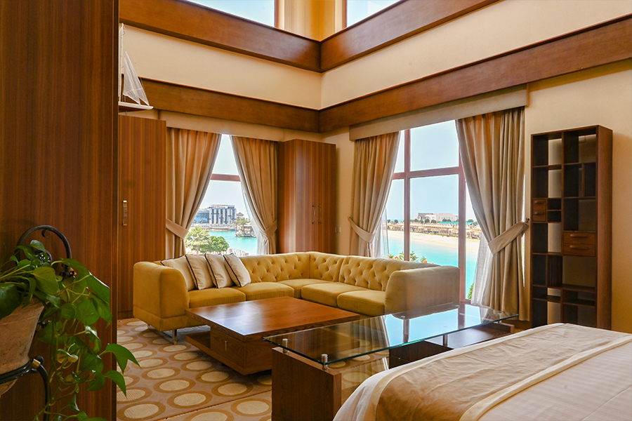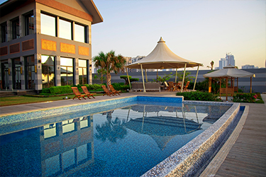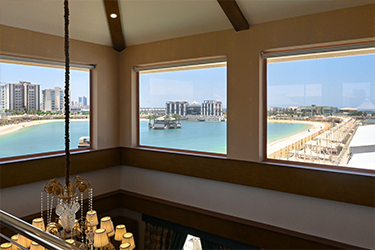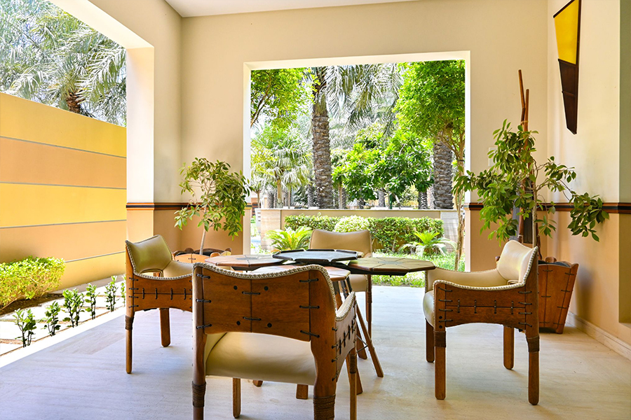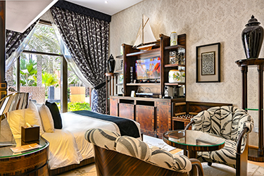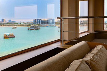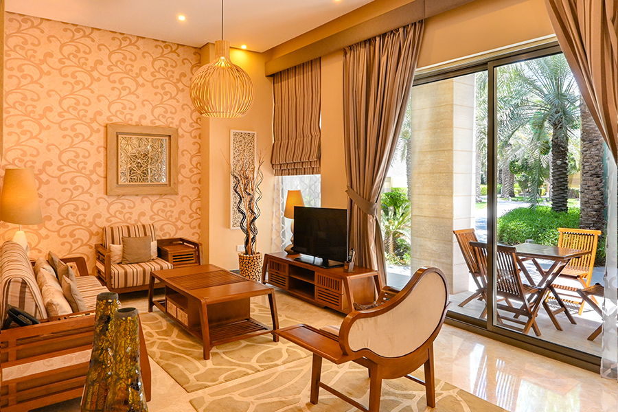 The high quality granite used for the villa’s facades, pedestrian walkway and stepping stones. The gardens are characterised by spacious landscaping with allotted areas surrounded by palm trees, artistic water features and teak wooden deck terraces. The dual swimming and wading pools tiled in Bisazza mosaic style have a backdrop of a wall water feature and overlook the open sea or lagoon.