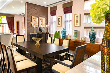 This Thai style villa enjoys a spacious lounge overlooking its private gardens and surrounded by a water feature that continues throughout the lobby and dining room. Marble flooring is used in the villa’s living spaces, while the bedrooms enjoy parquet flooring. The emphasis on luxurious quality is evident in the Grohe fixtures and kitchen from German brand Alno, as well as the use of the finest slate for the villa roof and high quality granite for its facades, pedestrian walkway and stepping stones. Amid the private gardens surrounded by palm trees and dotted with plant pots, residents can enjoy the gazebo, teak wooden deck terraces, water feature and surrounding swimming pool tiled in Bisazza mosaic style and overlooking the open sea or lagoon.
