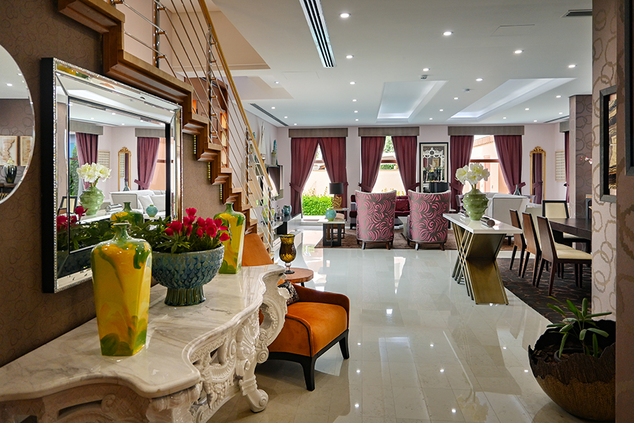 Inside this majestic Mediterranean villa, living areas have been designed to be ultra spacious. The ground floor employs double height across the formal lounge, reception area and majlis, with the latter incorporating a water feature. Marble flooring is used throughout the villa’s living spaces, while the bedrooms enjoy parquet flooring.